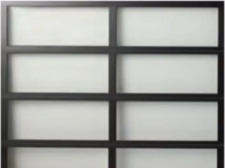 Our Model 8450 offers mirrored and opaque glass options. As well as powder coat and anodized options for the aluminum structure of the garage door. As the Glass panels are mounted on top of the aluminum structure for a state-of-the-art low maintenance garage door.